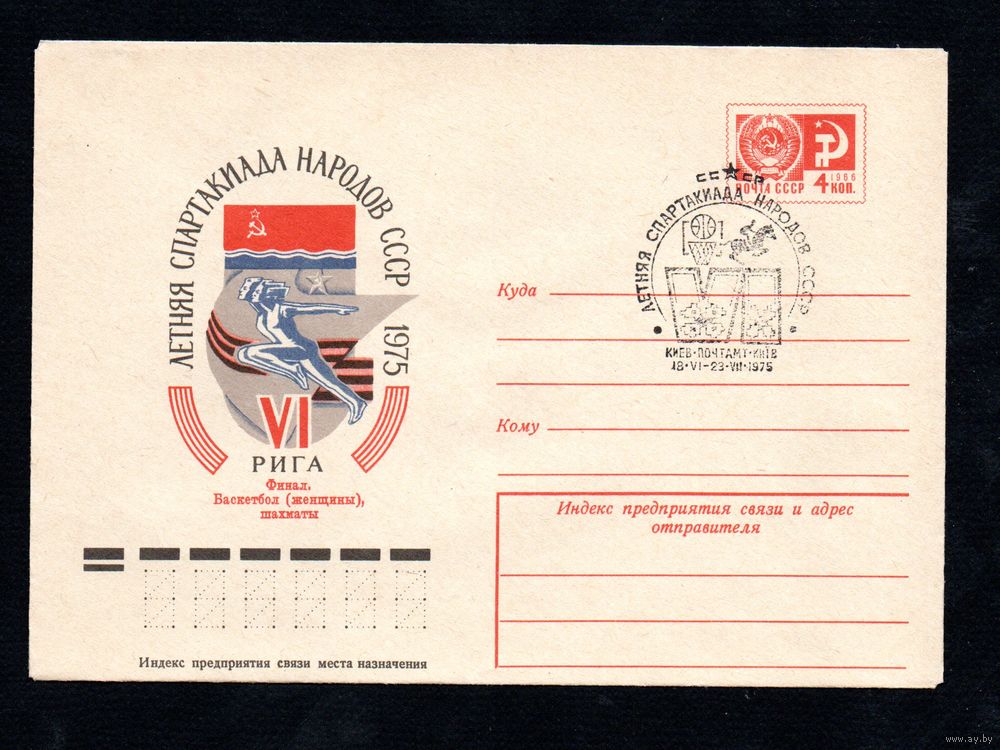 Художественный маркированный конверт СССР со спецгашением N 10301 (05.02.1975) VI летняя Спартакиада народов СССР 1975 Рига Финал. Баскетбол (женщины), шахматы