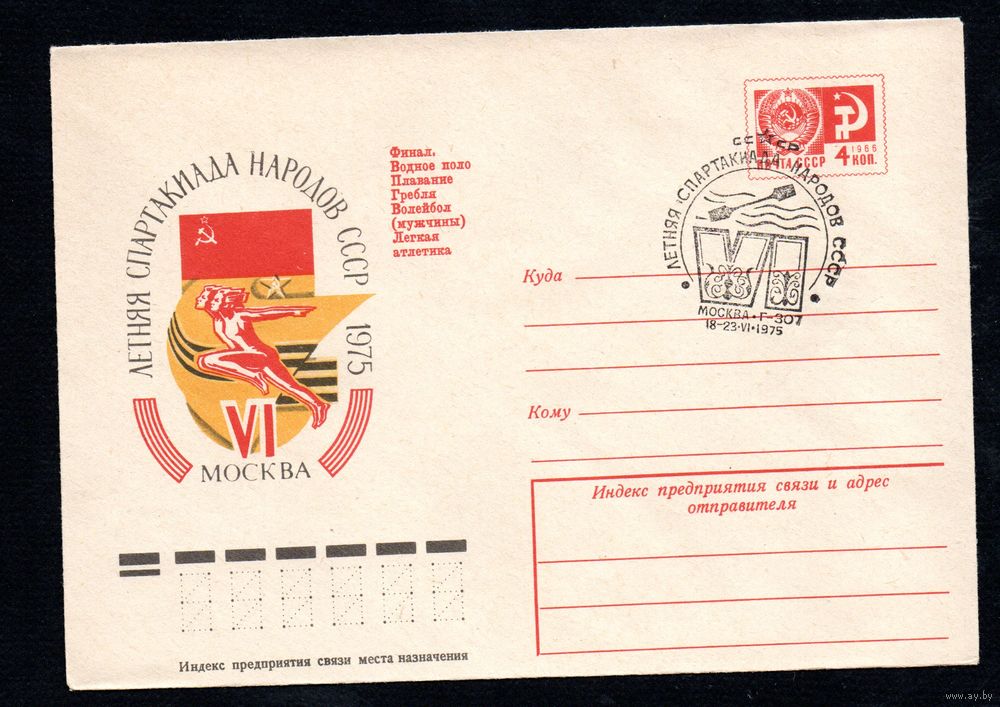 Художественный маркированный конверт СССР со спецгашением N 10320 (14.02.1975) VI летняя Спартакиада народов СССР 1975 Москва Финал. Водное поло Плавание Гребля Волейбол (мужчины) Легкая атлетика