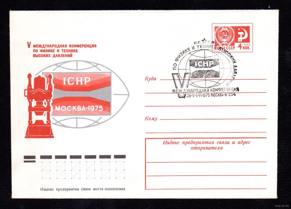 Художественный маркированный конверт СССР со спецгашением N 10413 (25.03.1975) V Международная конференция по физике и технике высоких давлений ICHP Москва 1975