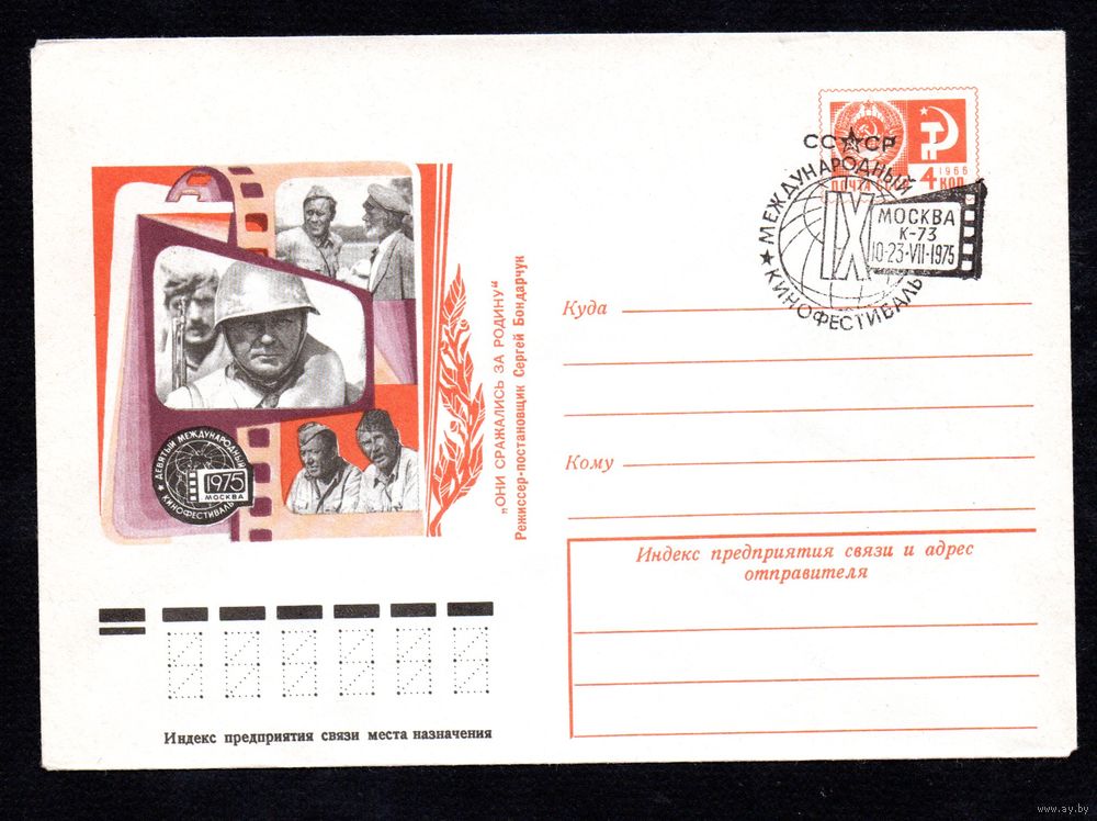 Художественный маркированный конверт СССР со спецгашением N 10592 (11.06.1975) Девятый международный кинофестиваль Москва 1975 "Они сражались за Родину" Режиссер-постановщик Сергей Бондарчук