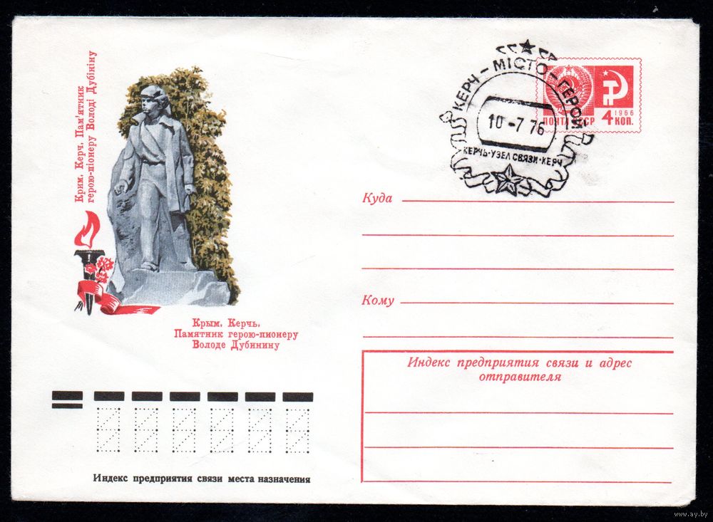 Художественный маркированный конверт СССР со спецгашением N 11082 (27.01.1976) Крым. Керчь. Памятник герою-пионеру Володе Дубинину