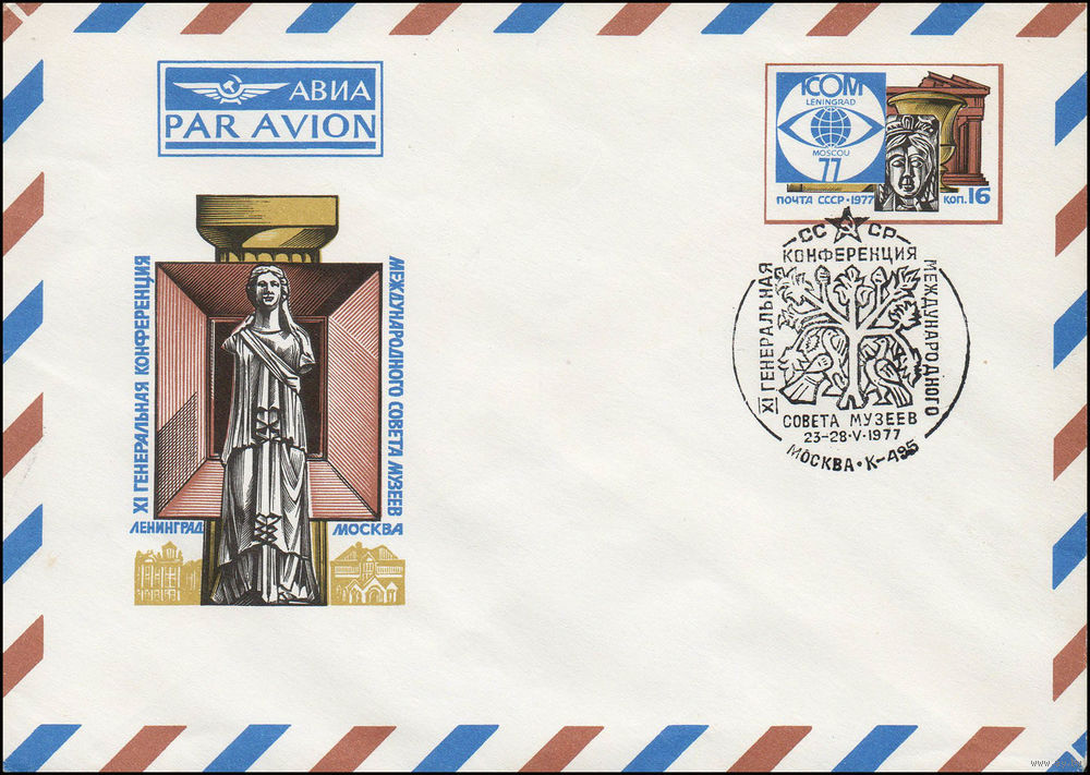 Художественный маркированный конверт СССР со спецгашением N 11977 (04.04.1977) АВИА PAR AVION XI Генеральная конференция Международного Совета музеев Ленинград Москва