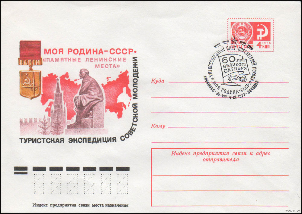 Художественный маркированный конверт СССР со спецгашением N 12110 (30.05.1977) Моя Родина - СССР Туристская экспедиция советской молодежи "Памятные ленинские места"