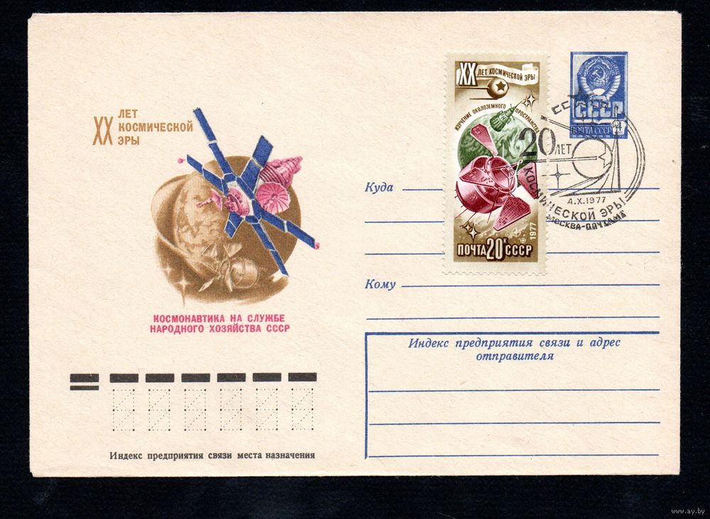 Художественный маркированный конверт СССР со спецгашением N 12318 (16.08.1977) XX лет космической эры Космонавтика на службе народного хозяйства СССР