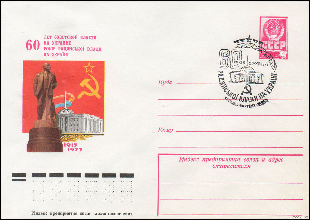 Художественный маркированный конверт СССР со спецгашением N 12469 (24.11.1977) 60 лет советской власти на Украине