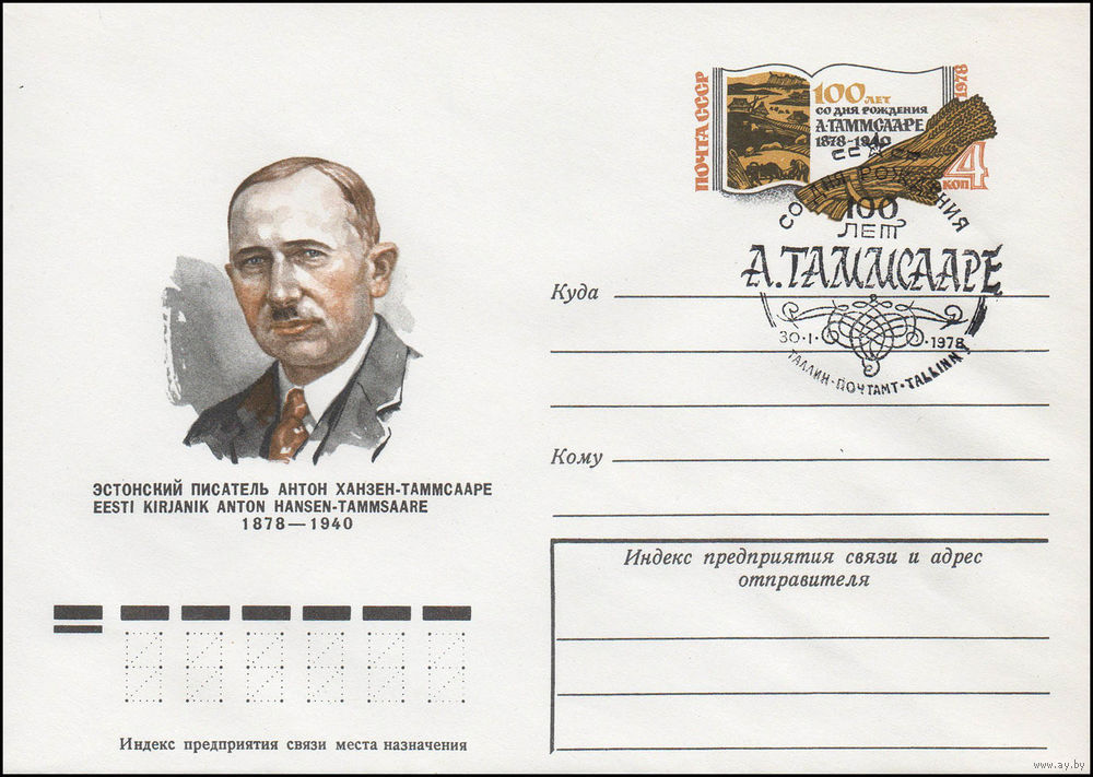 ![Художественный маркированный конверт СССР со спецгашением N 12522 (20.12.1977) Эстонский писатель Антон Ханзен-Таммсааре [100 лет со дня рождения А. Таммсааре 1878-1940]](https://s5-lot.aystatic.by/550x510/708/439/5040/5040439708_0.jpg)