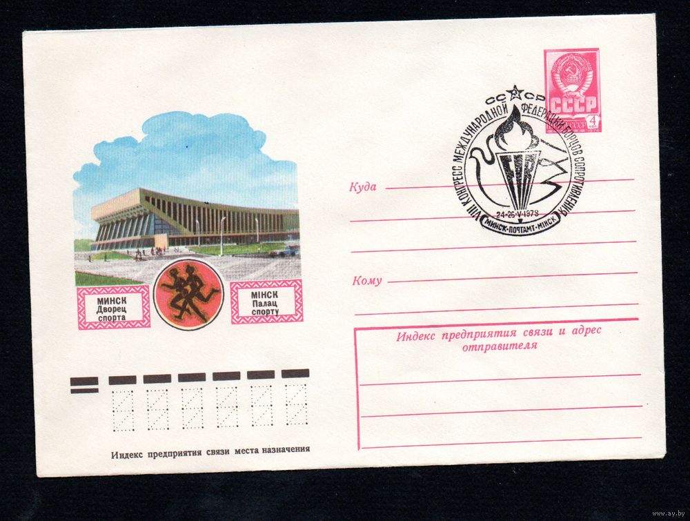 Художественный маркированный конверт СССР со спецгашением N 12530 (20.12.1977) Минск Дворец спорта