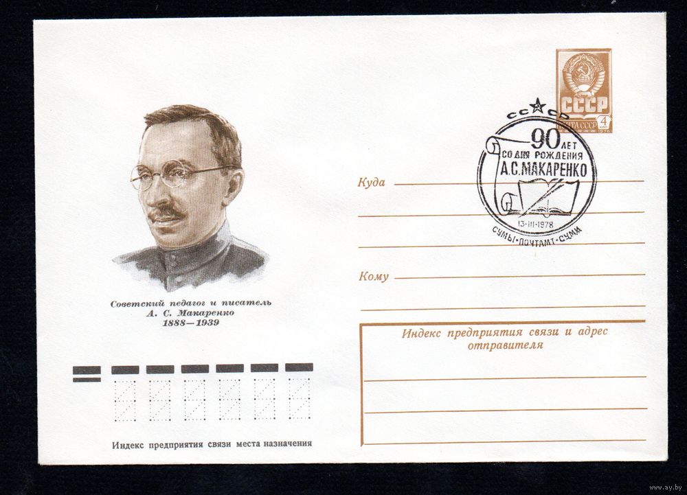 Художественный маркированный конверт СССР со спецгашением N 12637 (07.02.1978) Советский педагог и писатель А.С. Макаренко 1888-1939