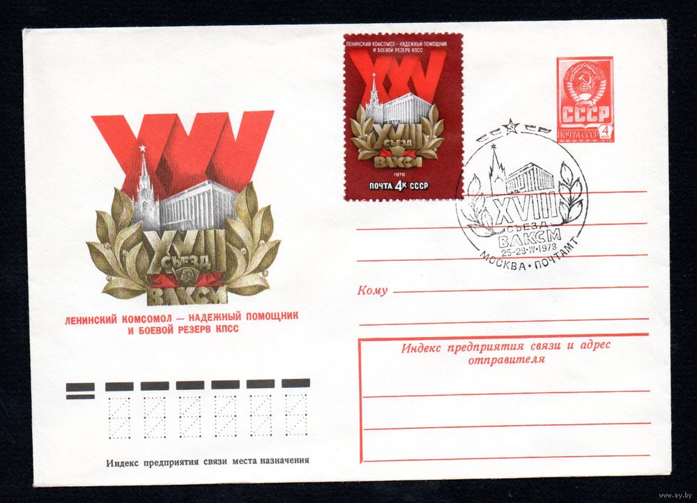 Художественный маркированный конверт СССР со спецгашением N 12693 (28.02.1978) XVIII съезд ВЛКСМ Ленинский комсомол - надежный помощник и боевой резерв КПСС