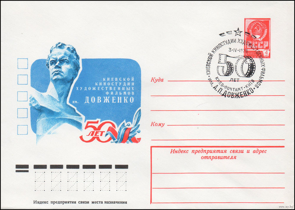 Художественный маркированный конверт СССР со спецгашением N 12723 (15.03.1978) Киевской киностудии Художественных фильмов им. Довженко 50 лет