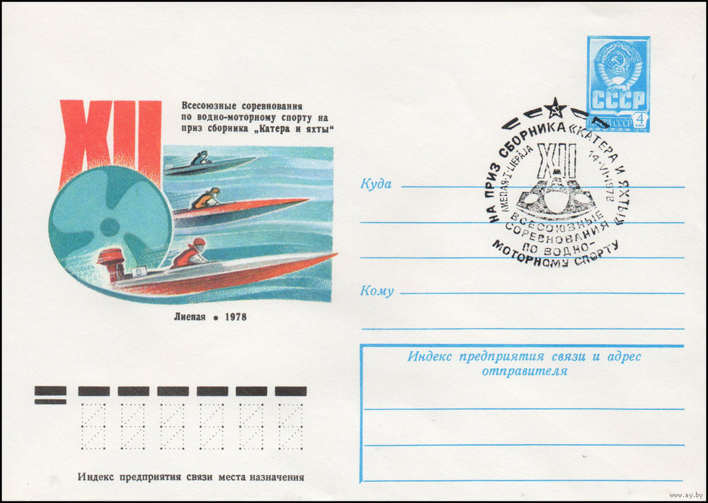 Художественный маркированный конверт СССР со спецгашением N 12815 (04.05.1978) XII Всесоюзные соревнования по водно-моторному спорту на приз сборника "Катера и яхты" Лиепая 1978