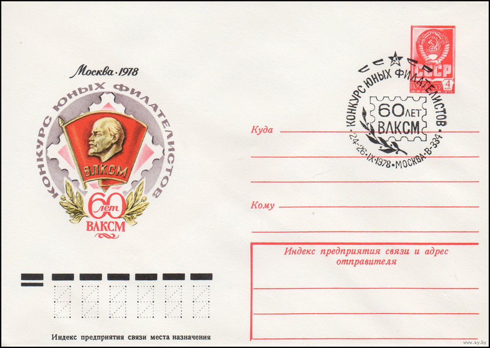 Художественный маркированный конверт СССР со спецгашением N 12884 (16.06.1978) Конкурс юных филателистов Москва 1978 60 лет ВЛКСМ