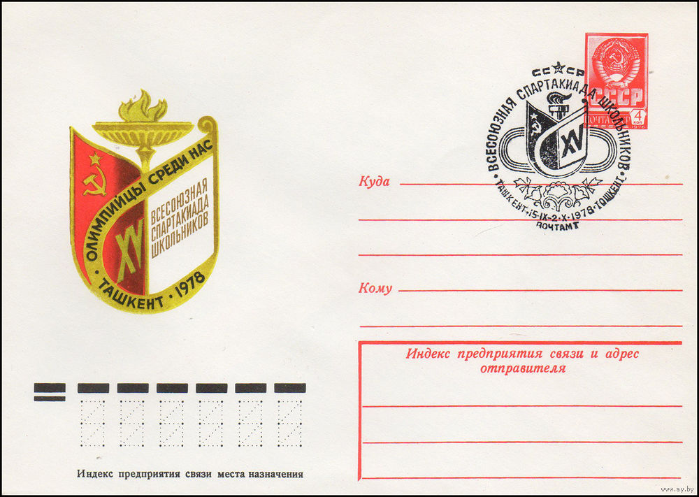 Художественный маркированный конверт СССР со спецгашением N 12917 (05.07.1978) XV Всесоюзная спартакиада школьников Олимпийцы среди нас Ташкент 1978