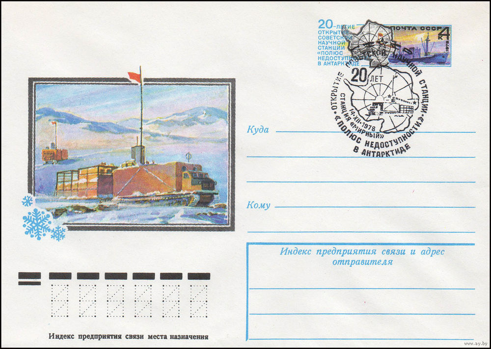 Художественный маркированный конверт СССР со спецгашением N 13071 (18.09.1978) 20-летие открытия советской научной станции "Полюс недоступности" в Антарктиде