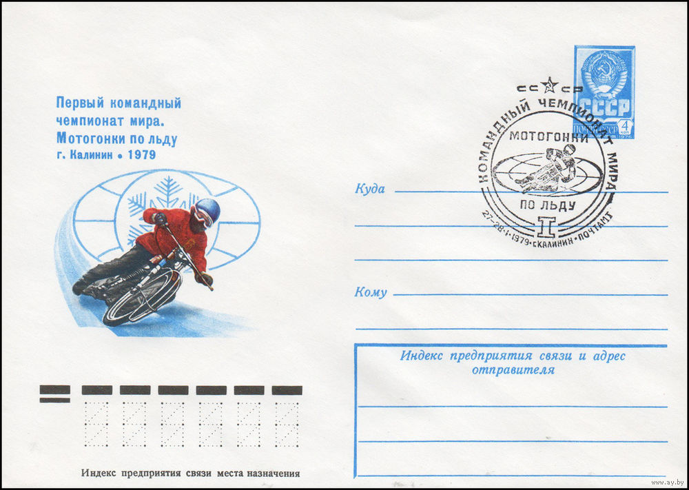 Художественный маркированный конверт СССР со спецгашением N 13218 (18.12.1978) Первый командный чемпионат мира. Мотогонки по льду г. Калинин 1979