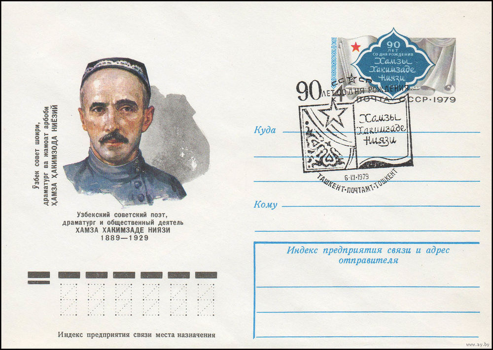 Художественный маркированный конверт СССР со спецгашением N 13316 (06.02.1979) Узбекский советский поэт, драматург и общественный деятель Хамза Хакимзаде Ниязи 1889-1929