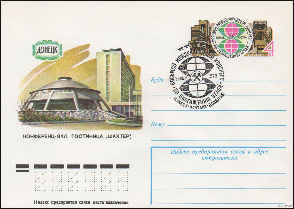 Художественный маркированный конверт СССР со спецгашением N 13326 (13.02.1979) Донецк Конференц-зал. Гостиница "Шахтер".