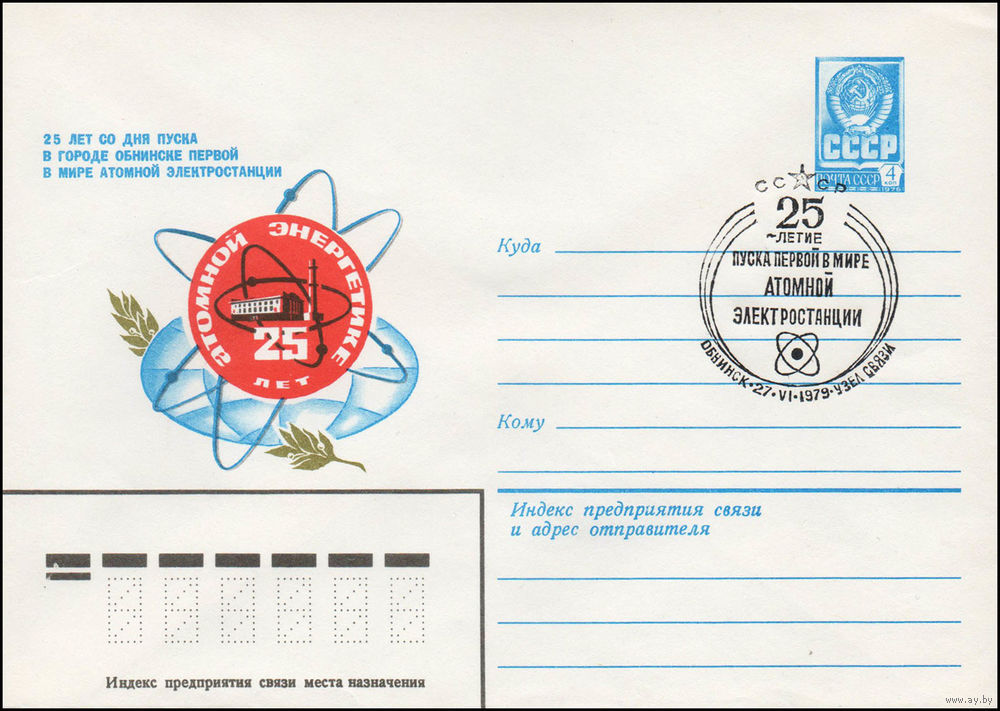 Художественный маркированный конверт СССР со спецгашением N 13587 (15.06.1979) 25 лет атомной энергетике 25 лет со дня пуска в городе Обнинске первой в мире атомной электростанции