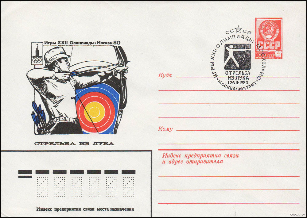 Художественный маркированный конверт СССР со спецгашением N 13768 (13.09.1979) Игры XXII Олимпиады Москва-80 Стрельба из лука