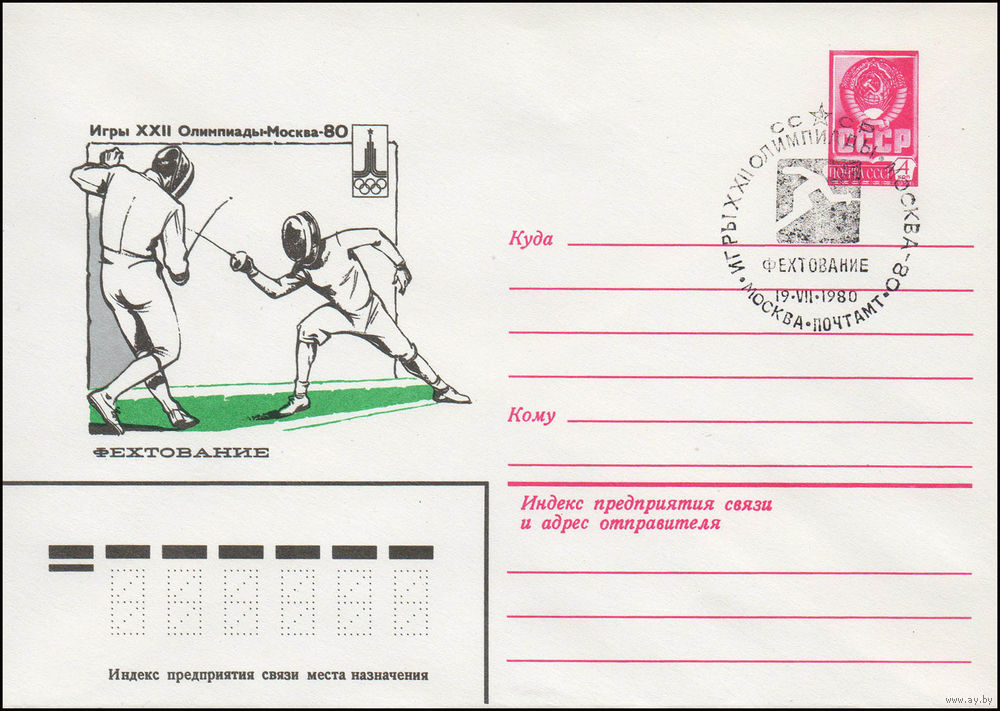 Художественный маркированный конверт СССР со спецгашением N 13769 (13.09.1979) Игры XXII Олимпиады Москва-80 Фехтование