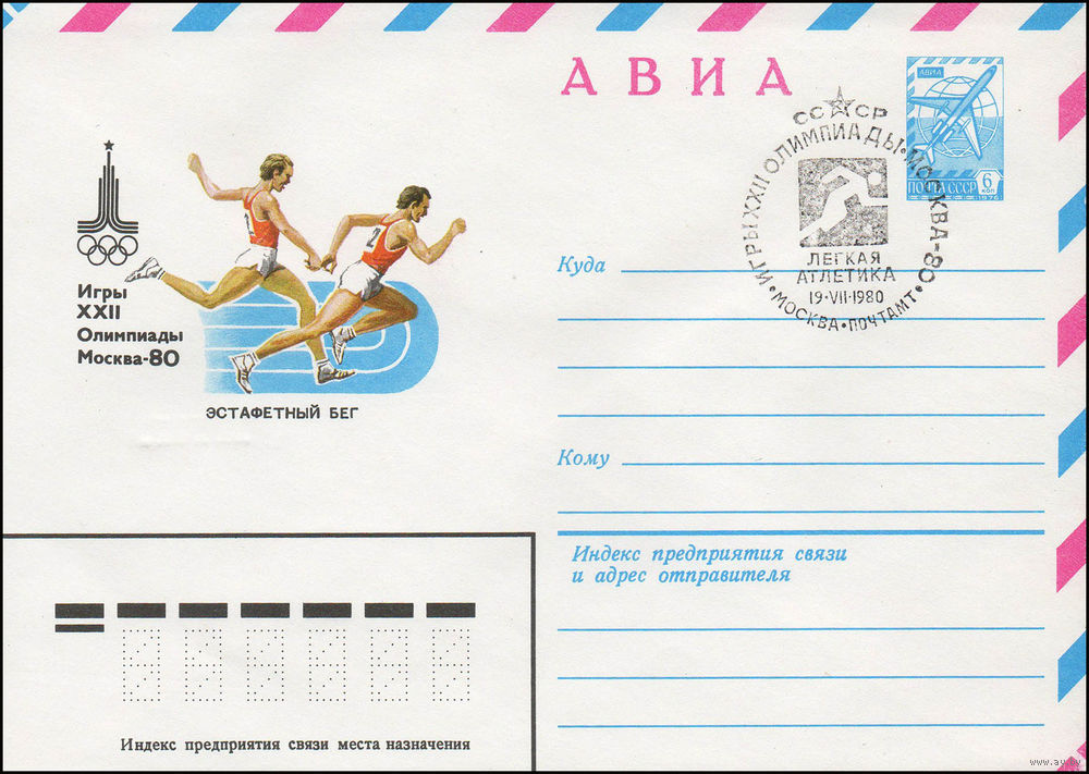 Художественный маркированный конверт СССР со спецгашением N 13782 (13.09.1978) АВИА Игры XXII Олимпиады Москва-80 Эстафетный бег