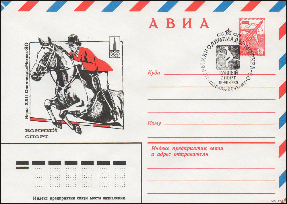 Художественный маркированный конверт СССР со спецгашением N 13786 (13.09.1979) АВИА Игры XXII Олимпиады Москва-80 Конный спорт