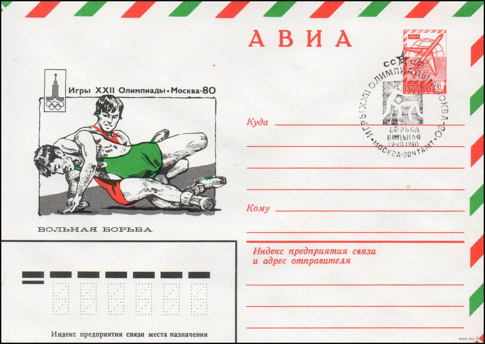 Художественный маркированный конверт СССР со спецгашением N 13788 (13.09.1979) АВИА Игры XXII Олимпиады Москва-80 Вольная борьба