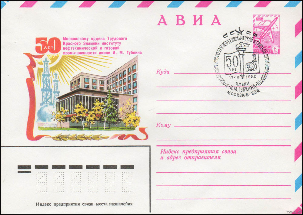 Художественный маркированный конверт СССР со спецгашением N 13928 (27.11.1979) АВИА 50 лет Московскому ордена Трудового Красного Знамени институту нефтехимической и газовой промышленности