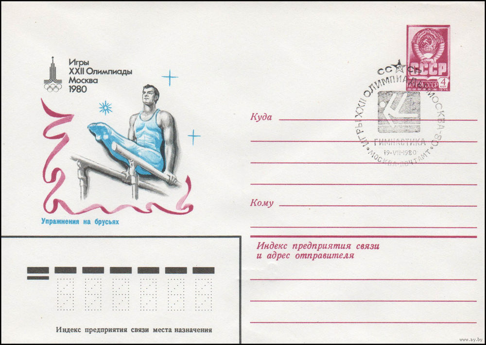 Художественный маркированный конверт СССР со спецгашением N 14045 (07.01.1980) Игры XXII Олимпиады Москва 1980 Упражнения на брусьях