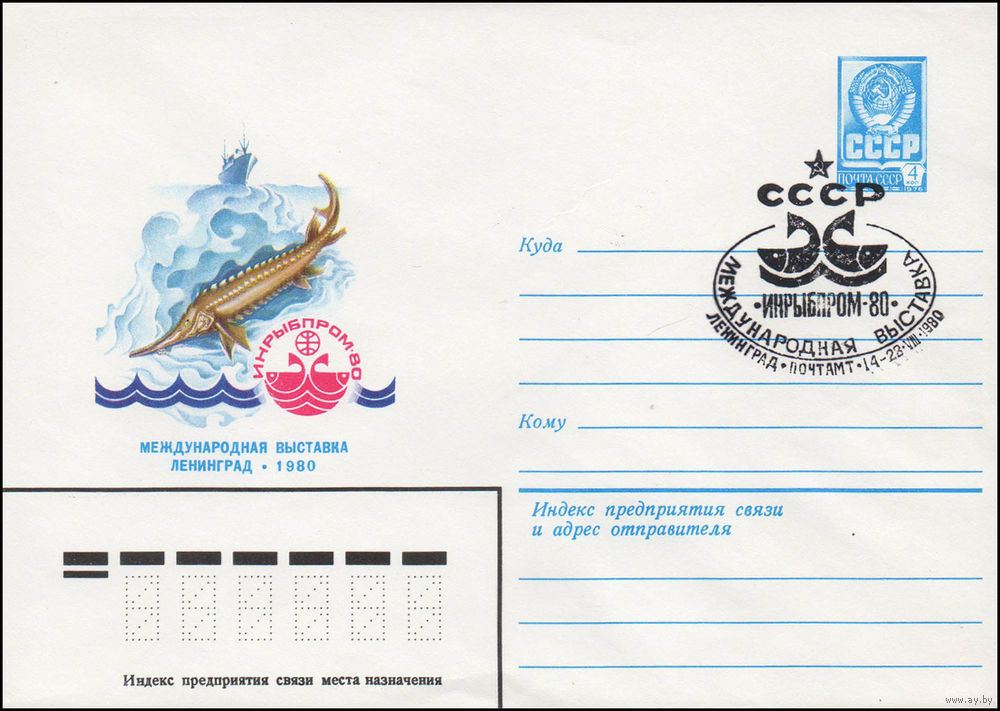 Художественный маркированный конверт СССР со спецгашением N 14145 (26.02.1980) Инрыбпром-80 Международная выставка Ленинград 1980