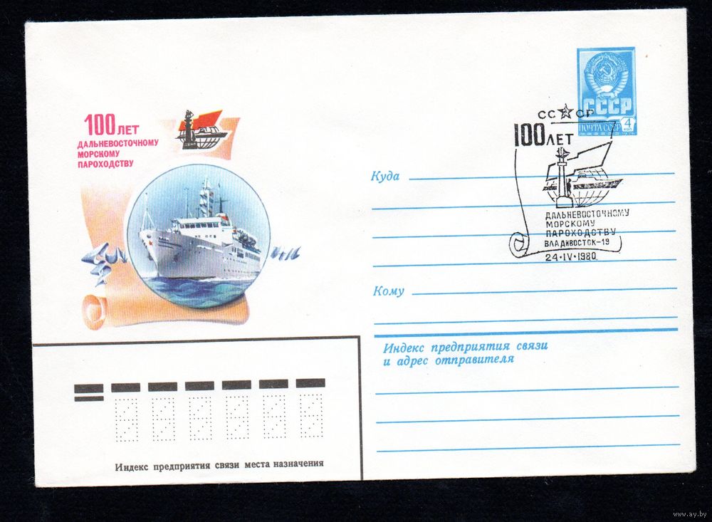 Художественный маркированный конверт СССР со спецгашением N 14190 (17.03.1980) 100 лет Дальневосточному морскому пароходству