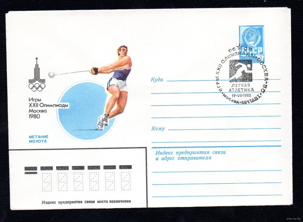 Художественный маркированный конверт СССР со спецгашением N 14208 (27.03.1980) Игры XXII Олимпиады Москва 1980 Метание молота