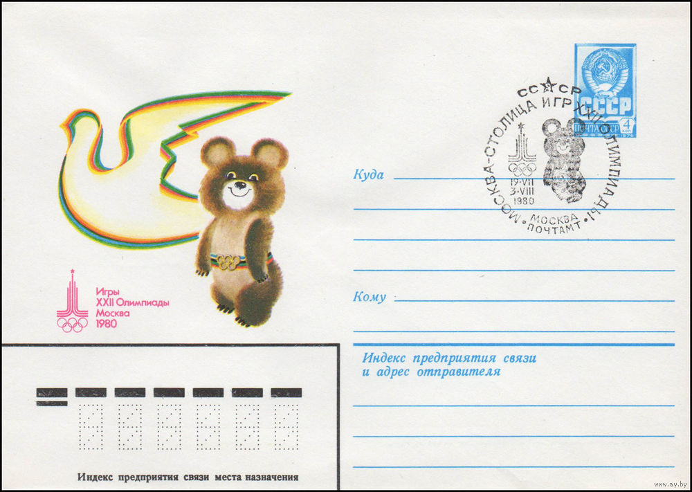 Художественный маркированный конверт СССР со спецгашением N 14216 (02.04.1980) Игры XXII Олимпиады Москва 1980 Рисунок талисмана