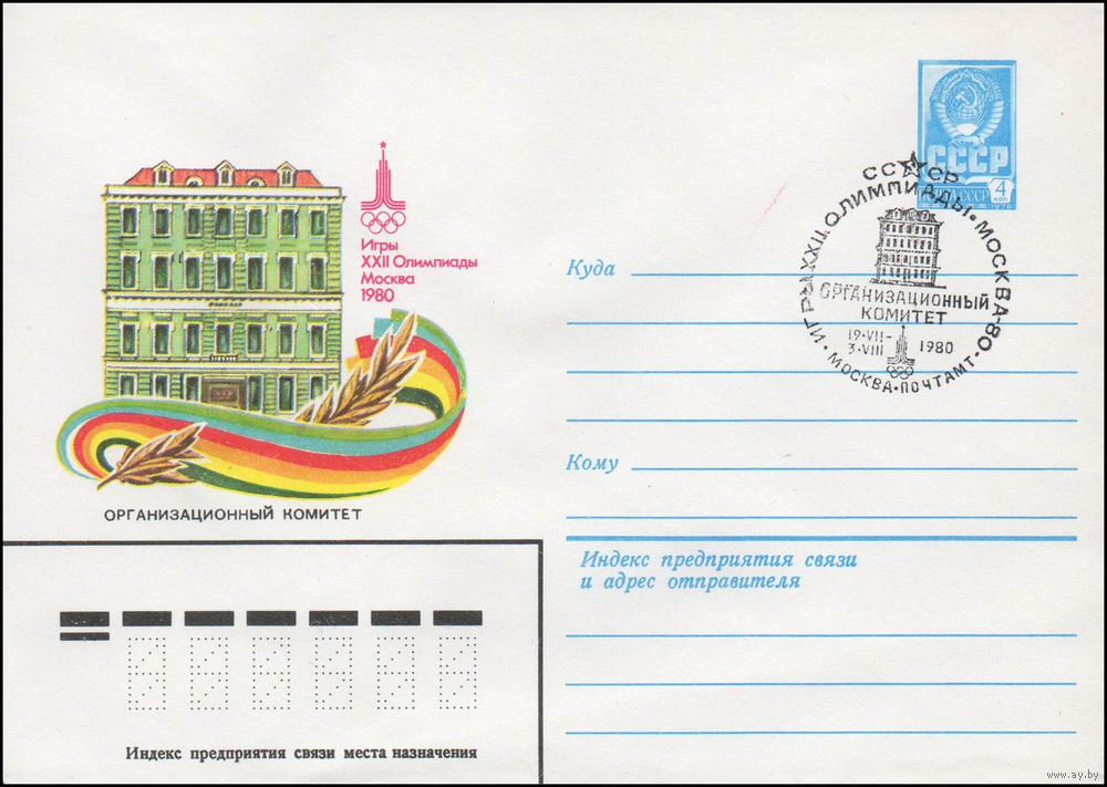 Художественный маркированный конверт СССР со спецгашением N 14230 (02.04.1980) Игры XXII Олимпиады Москва 1980 Организационный Комитет