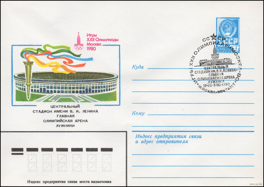 Художественный маркированный конверт СССР со спецгашением N 14284 (30.04.1980) Игры XXII Олимпиады Москва 1980 Центральный стадион имени В.И. Ленина Главная олимпийская арена Лужники