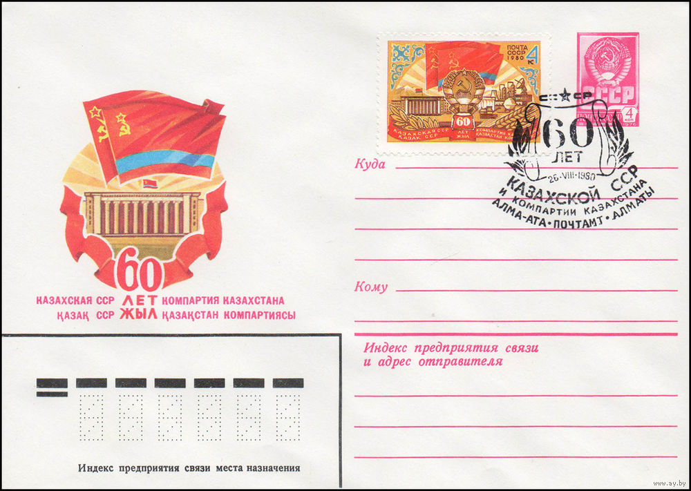 Художественный маркированный конверт СССР со спецгашением N 14360 (04.06.1980) 60 лет Казахская ССР Компартия Казахстана
