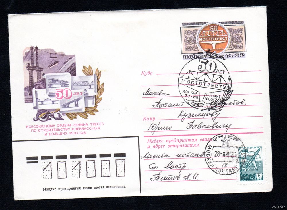 Художественный маркированный конверт СССР со спецгашением N 14372 (05.06.1980) 50 лет Всесоюзному ордена Ленина тресту по строительству внеклассных и больших мостов