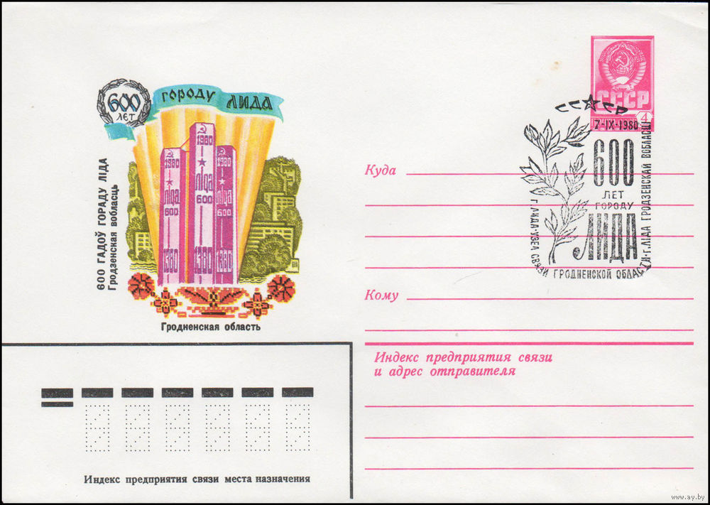 Художественный маркированный конверт СССР со спецгашением N 14416 (01.07.1980) 600 лет городу Лида Гродненская область
