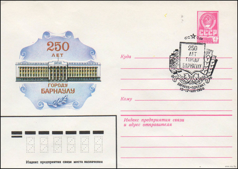 Художественный маркированный конверт СССР со спецгашением N 14443 (09.07.1980) 250 лет городу Барнаулу