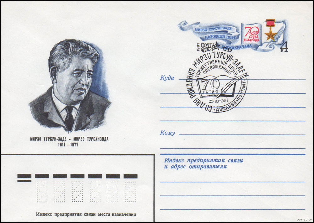 Художественный маркированный конверт СССР со спецгашением N 14668 (03.12.1980) Мирзо Турсун-Заде 1911-1977