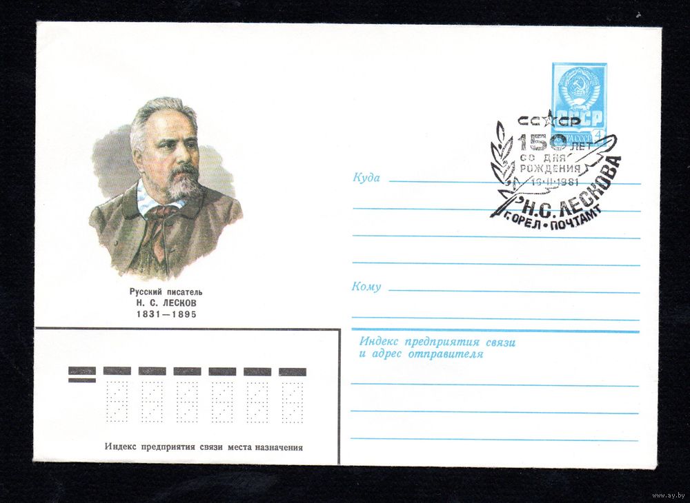Художественный маркированный конверт СССР со спецгашением N 14763 (26.01.1981) Русский писатель Н.С. Лесков 1831-1895