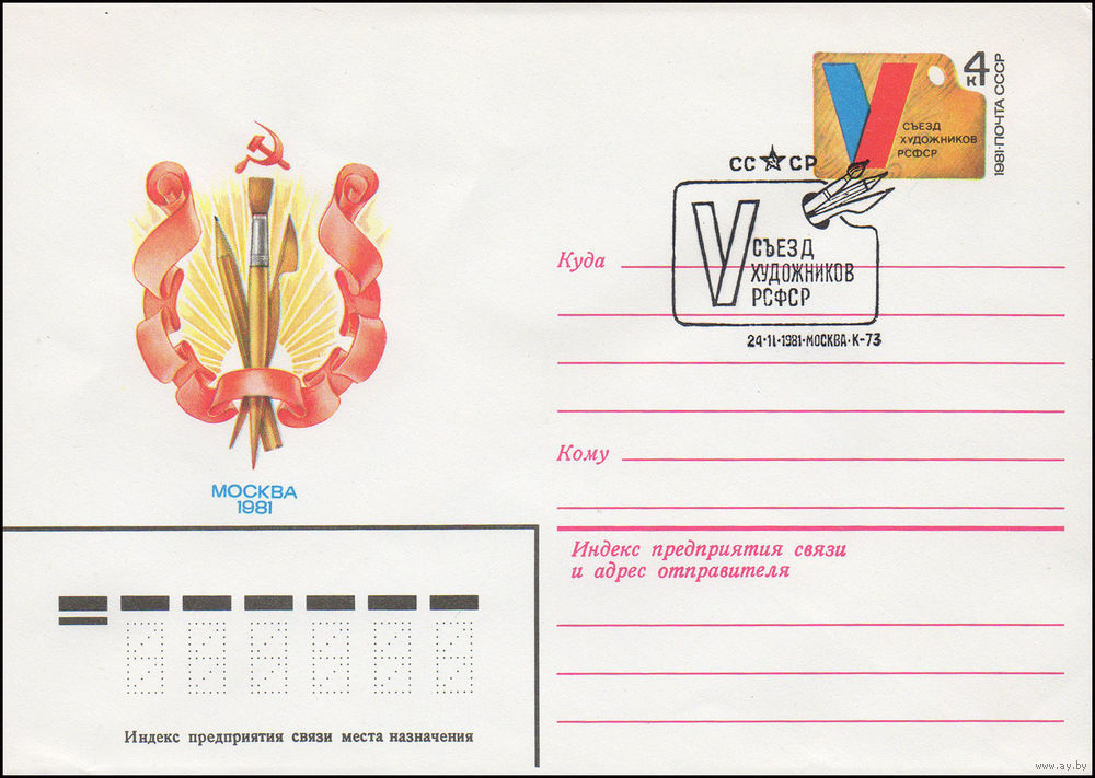 Художественный маркированный конверт СССР со спецгашением N 15068 (06.08.1981) Москва 1981 V Съезд художников РСФСР