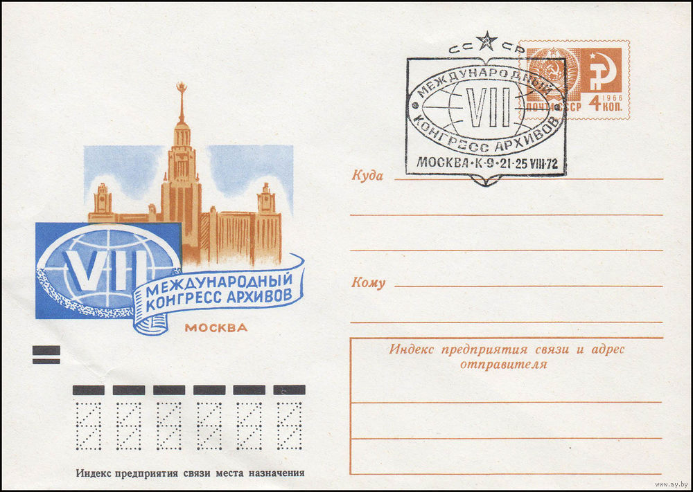 Художественный маркированный конверт СССР со спецгашением N 8098 (01.03.1972) VII Международный конгресс архивов Москва
