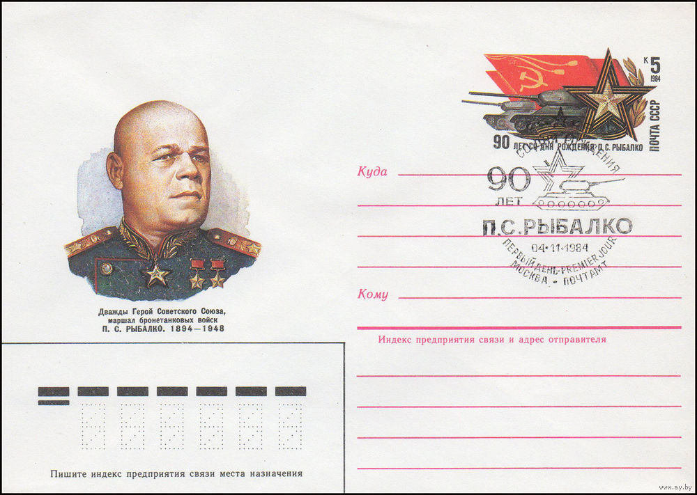 Художественный маркированный конверт СССР со спецгашением N 84-364 (16.08.1984) Дважды Герой Советского Союза, маршал бронетанковых войск П.С. Рыбалко 1894-1948