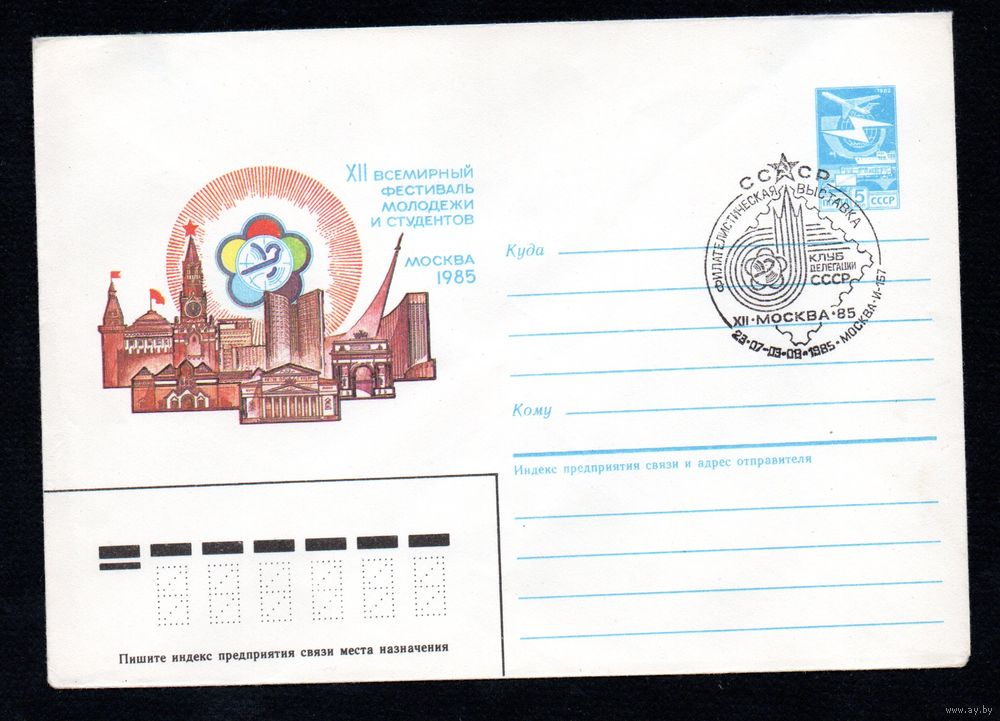 Художественный маркированный конверт СССР со спецгашением N 85-167 (02.04.1985) Всемирный фестиваль молодежи и студентов Москва 1985