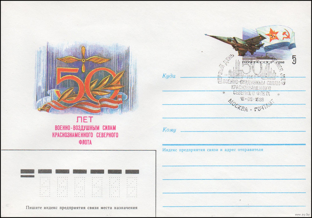 Художественный маркированный конверт СССР со спецгашением N 86-150 (27.03.1986) 50 лет Военно-воздушным силам Краснознаменного Северного флота