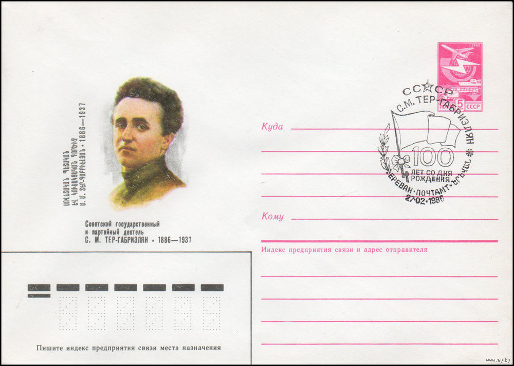 Художественный маркированный конверт СССР со спецгашением N 86-3 (13.01.1986) Советский государственный и партийный деятель С. М. Тер-Габриэлян 1886-1937