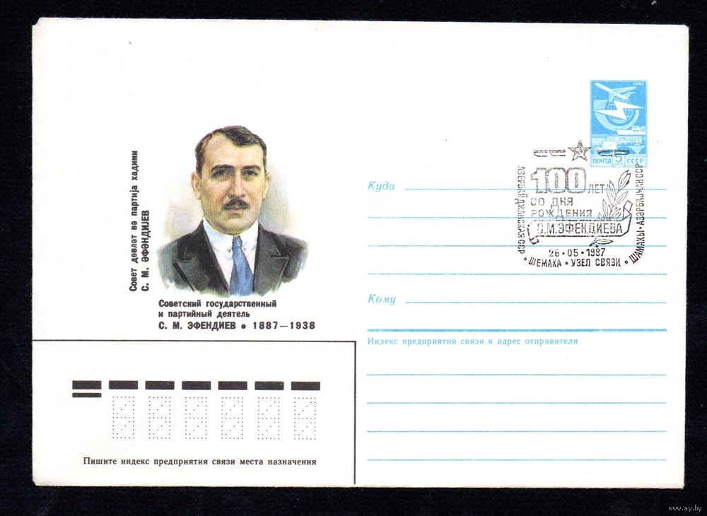 Художественный маркированный конверт СССР со спецгашением N 86-484 (20.10.1986) Советский государственный и партийный деятель С. М. Эфендиев 1887-1938