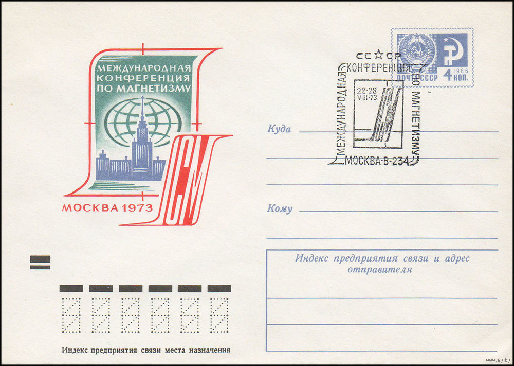 Художественный маркированный конверт СССР со спецгашением N 8675 (18.01.1973) Международная конференция по магнетизму Москва 1973