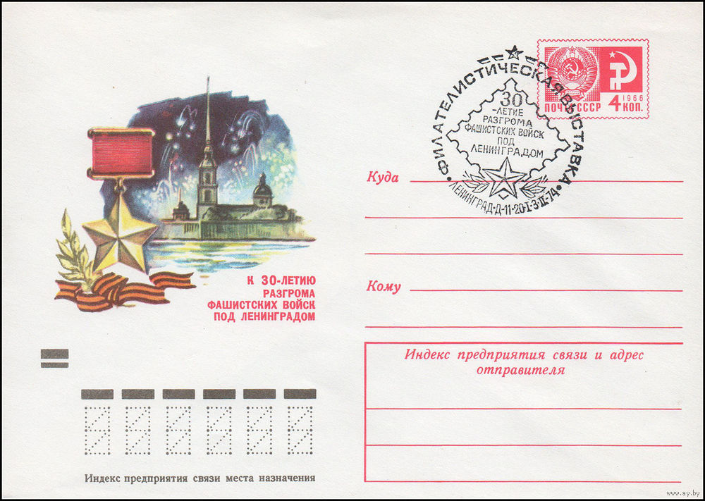 Художественный маркированный конверт СССР со спецгашением N 9359 (21.12.1973) К 30-летию разгрома фашистских войск под Ленинградом